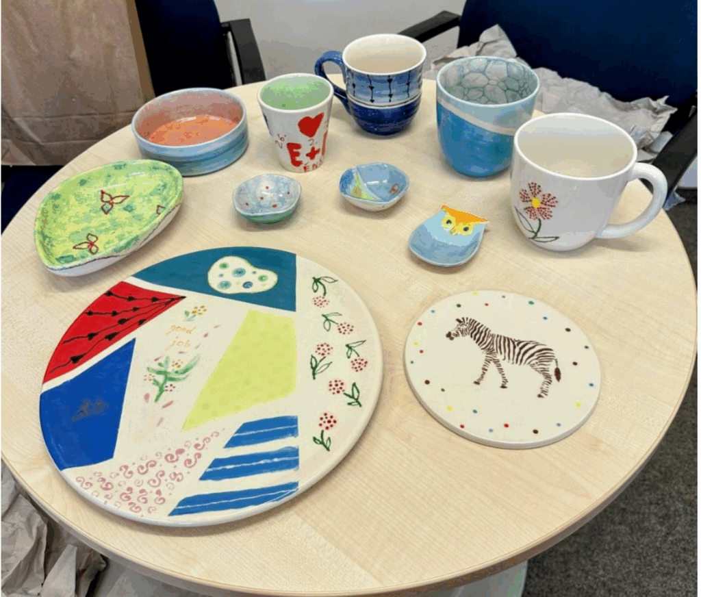 Wir konnten die Zeit ideal nutzen, Gespräche abseits von Arbeitsalltag zu suchen und uns gegenseitig Tipps zur Bemalung zu geben, da einige Kolleginnen bereits Erfahrungen bei der Keramikbemalung hatten. So konnten sie ihr Wissen an die Kollegen weitergeben, die bisher keine Erfahrung gesammelt hatten. Durch Ausprobieren verschiedener Gestaltungstechniken, sind die Ergebnisse sehr kreativ, vielfältig und bunt geworden und die Zeit verging wie im Flug. Die Rohlinge wurden von dem Keramikstudio gebrannt und konnten einige Tage später abgeholt werden. Nun steht die erste gemeinsame Pause mit selbstgestalteten Bechern, Schalen und selbstgebackenen Kuchen an. Ideen und Vorlieben zu süßen und herzhaften Kuchen-Varianten wurden bereits beim Malen ausgetauscht.