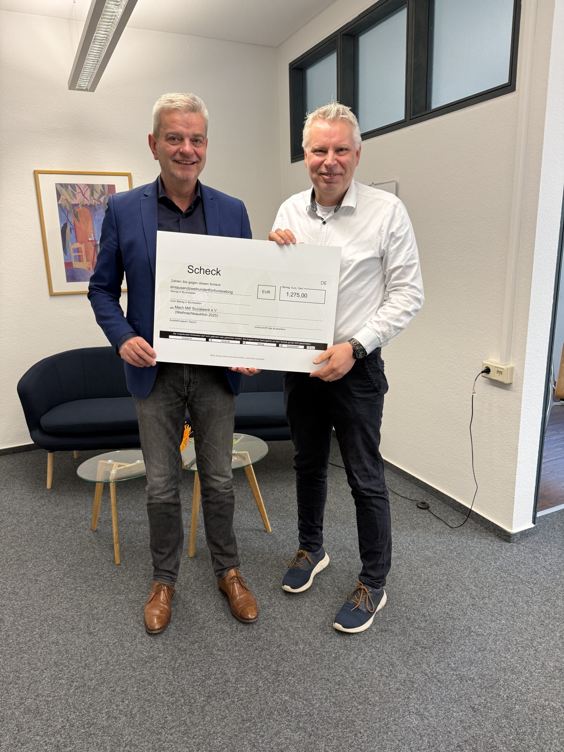 Der Erlös aus der Weihnachtsauktion in Höhe von 1.275,- Euro ist dem Sozialwerk MachMit! von Herrn Dr. Wonneberger an den Co-Vorsitzenden des Sozialwerks Roland Fraatz übergeben worden.